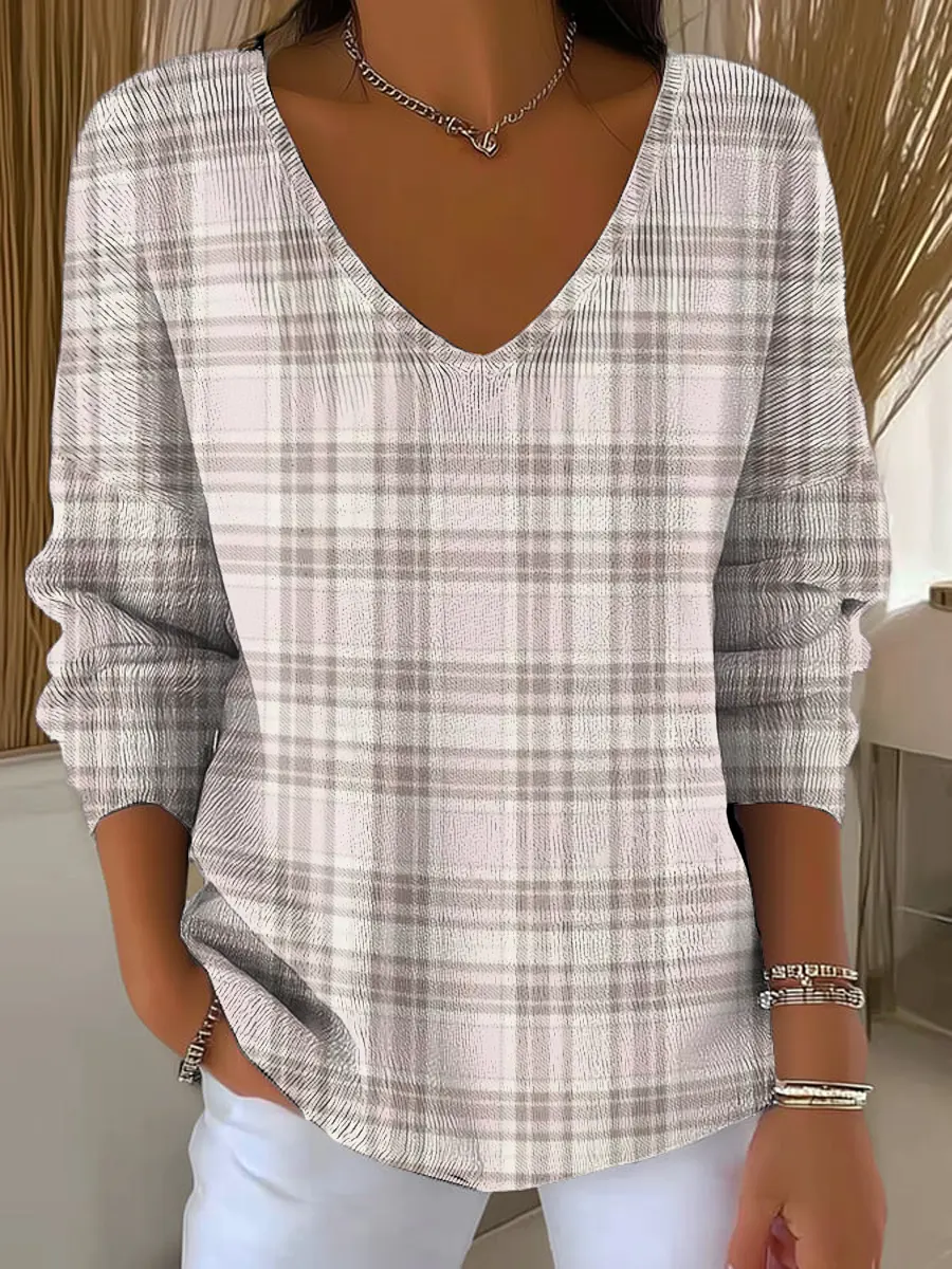 Vintage Retro Plaid Print V-neck Pullover Sweater