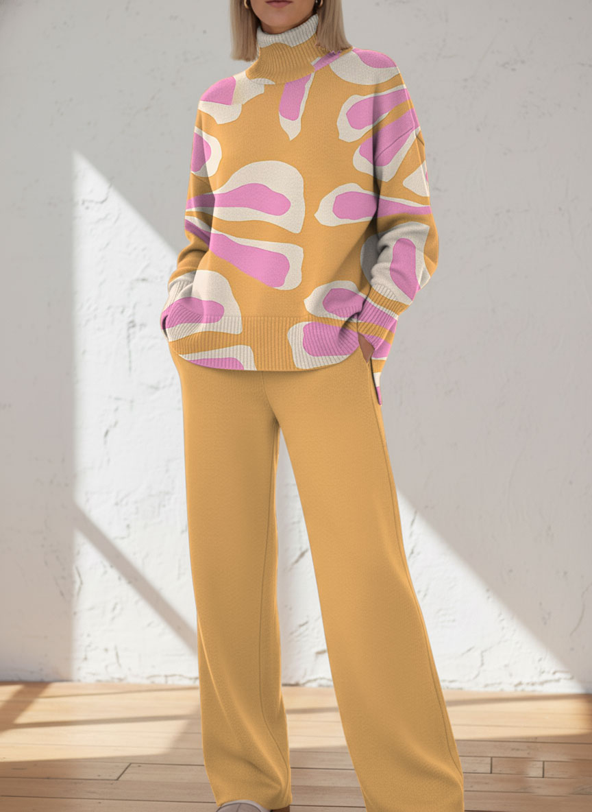 Women's Abstract Pattern Art Print Casual Knitted Cotton Top Pants Suit