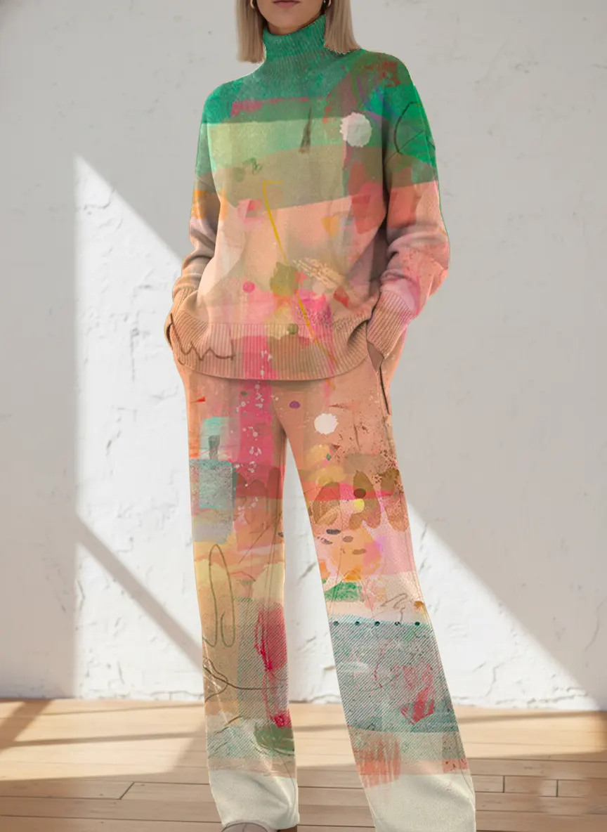 Women's Abstract Pattern Art Print Casual Knitted Cotton Top Pants Suit