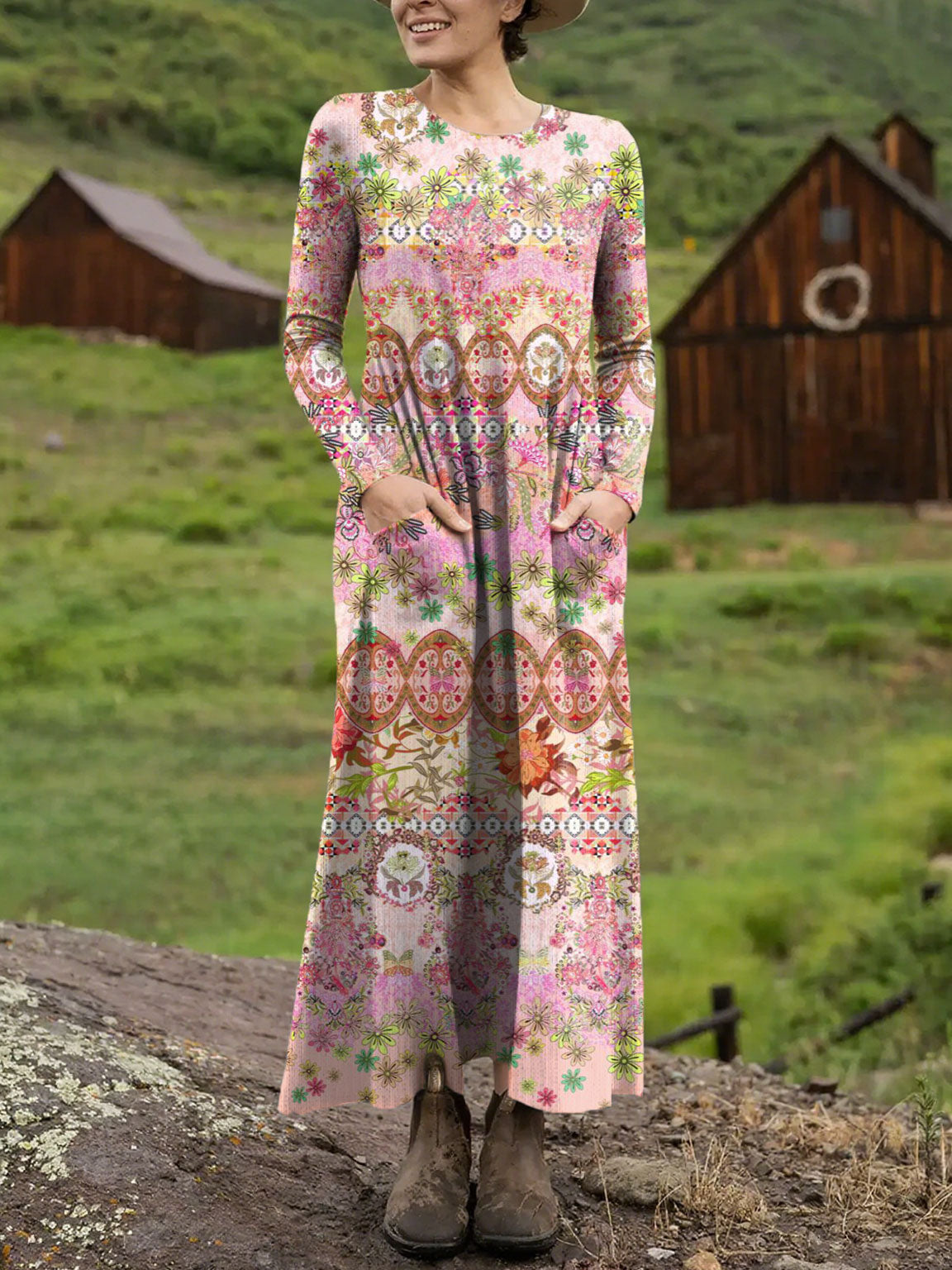 Women's Boho Vintage Flower Art Printed Long-sleeved Casual Dress