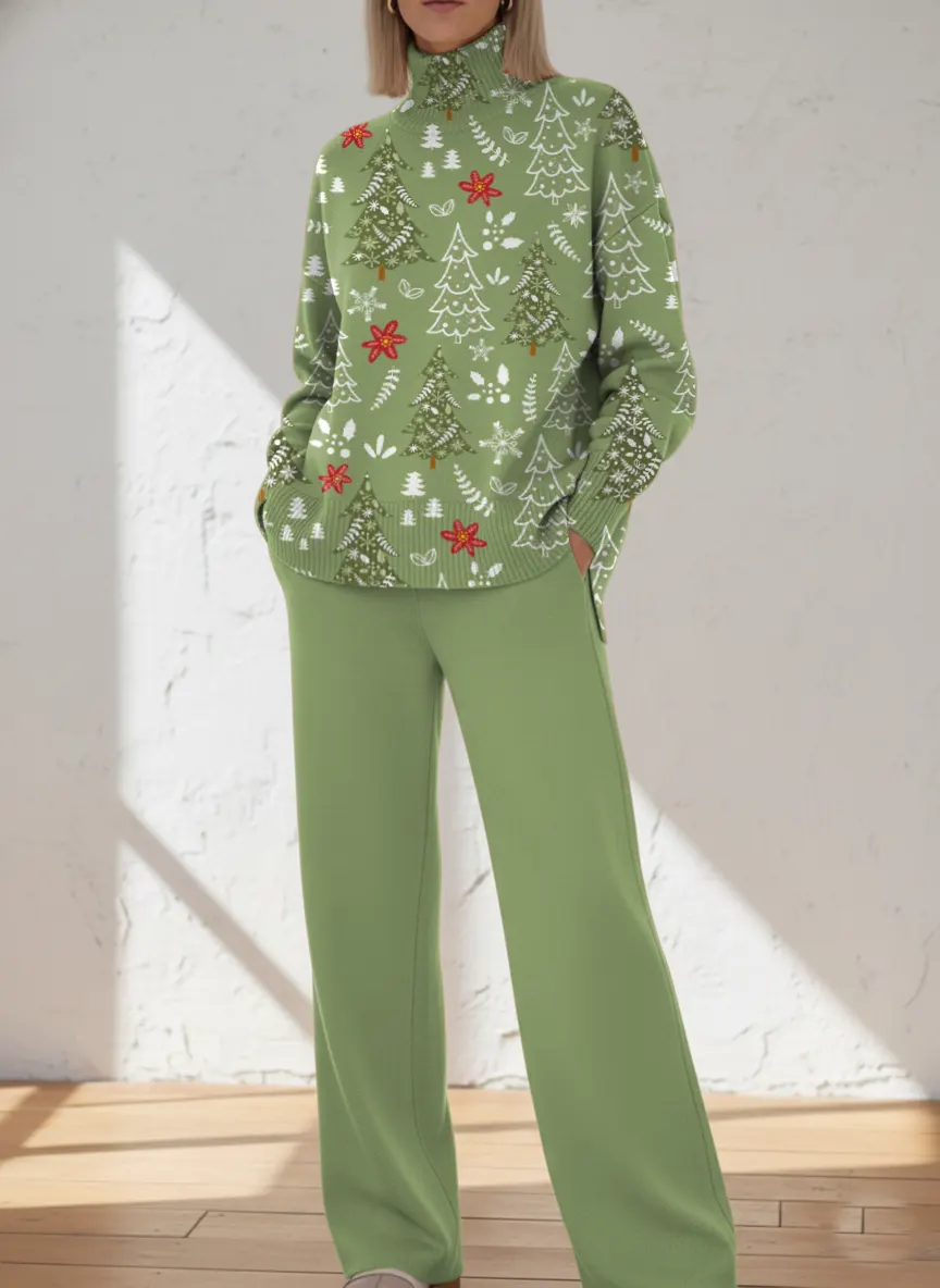 Women's Christmas Tree Pattern Art Print Casual Knitted Cotton Top Pants Suit