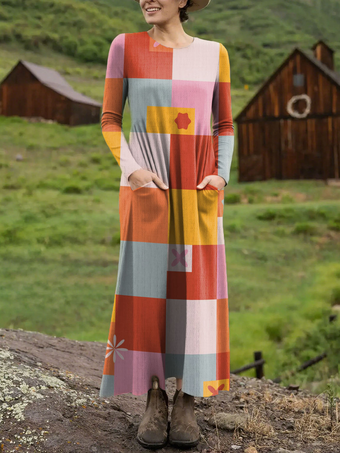 Women's Colorful Large grid Art Print Long-sleeved Dress