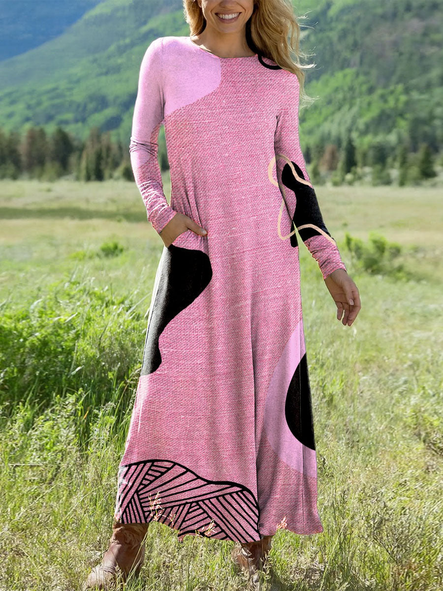 Women's Pink Irregular Art Print Long-sleeved Dress
