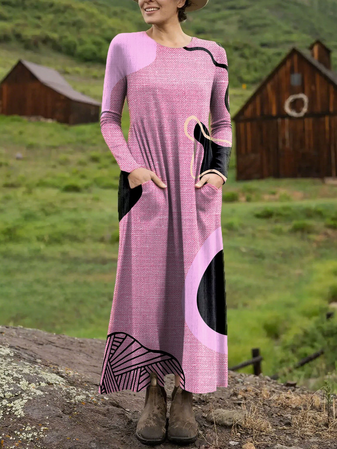 Women's Pink Irregular Pattern Art Print Long-sleeved Dress