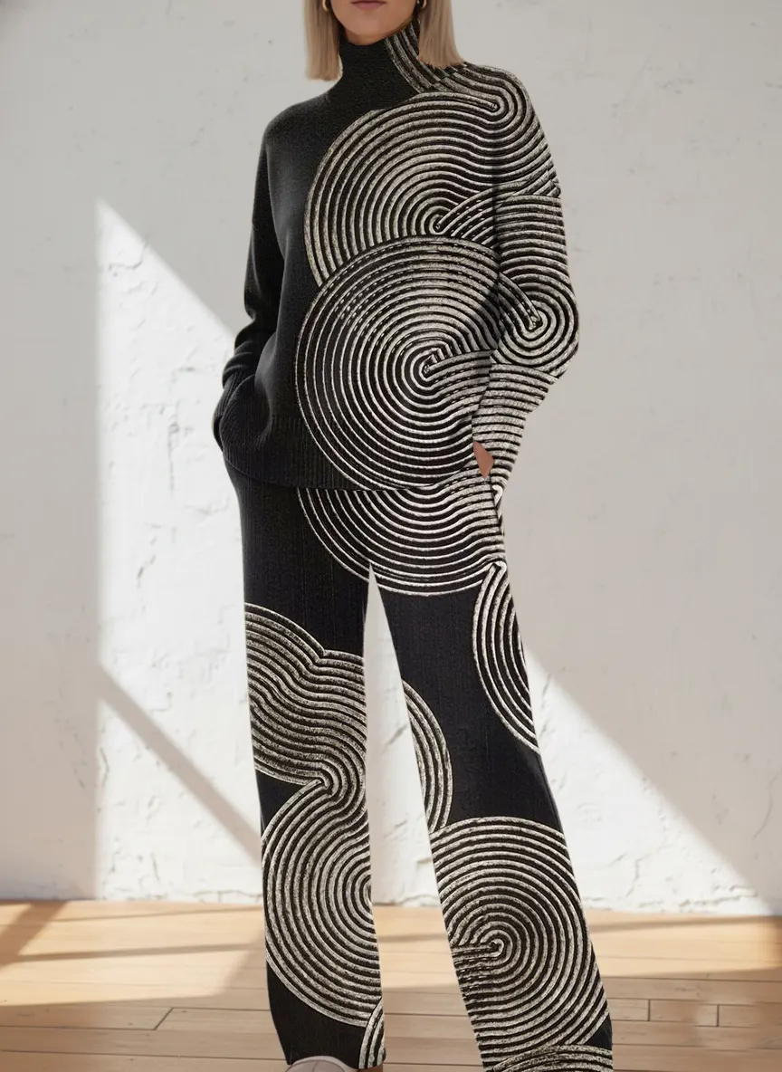 Women's Retro Abstract Geometric Art Print Casual Knit Set