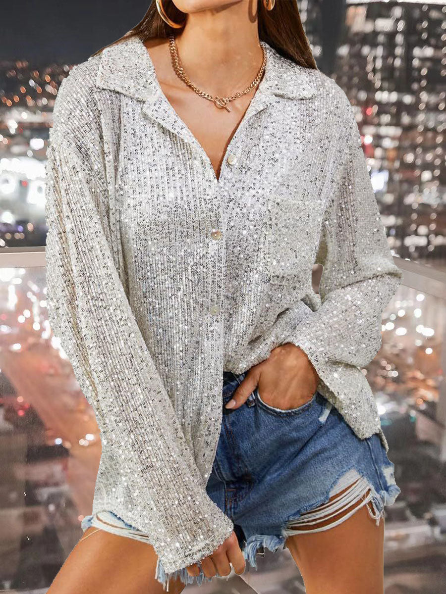 Women's Sequined Long Sleeve Lapel Shirt