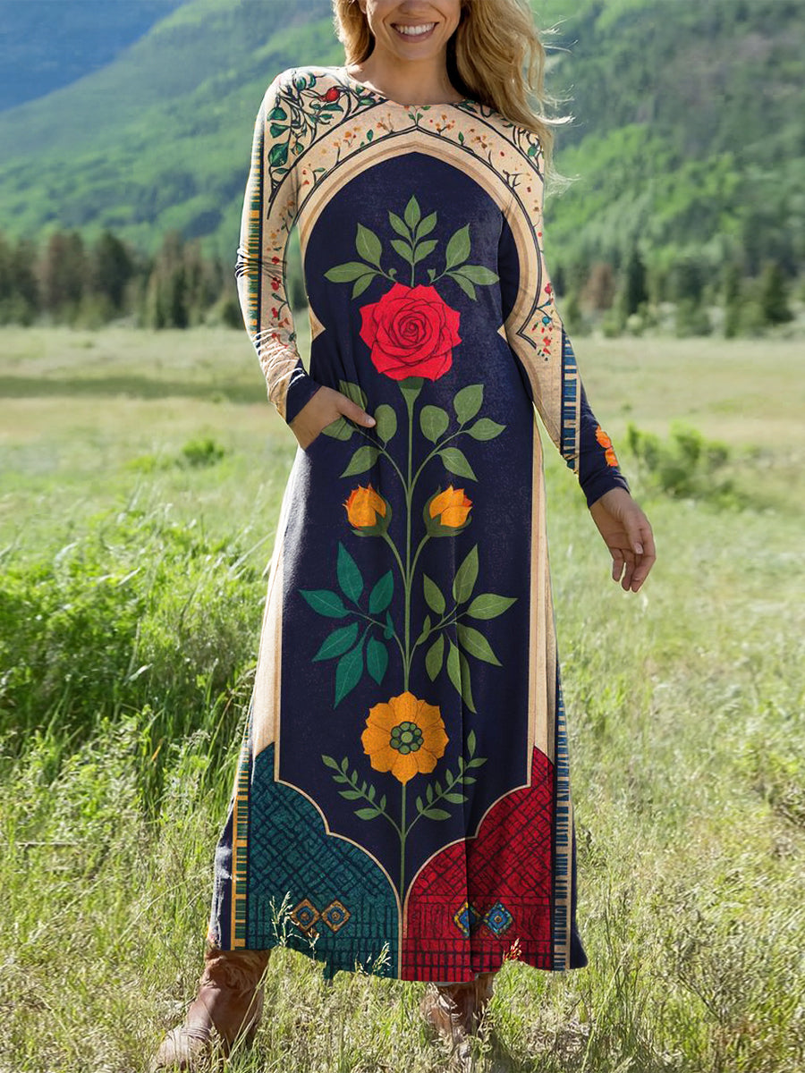 Women's Vintage Geometric Floral Art Print Long-sleeved Dress
