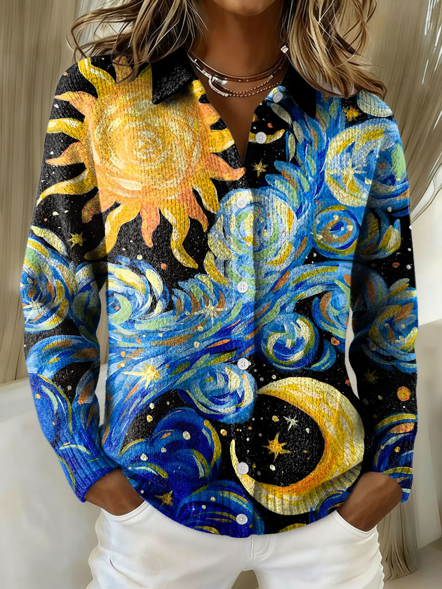 Women's Vintage Sun Moon Starry Sky Pattern Print Cowl Neck Sweater