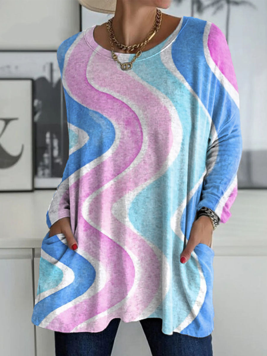 Women's Wave Print Casual V-neck Long Sleeve T-shirt